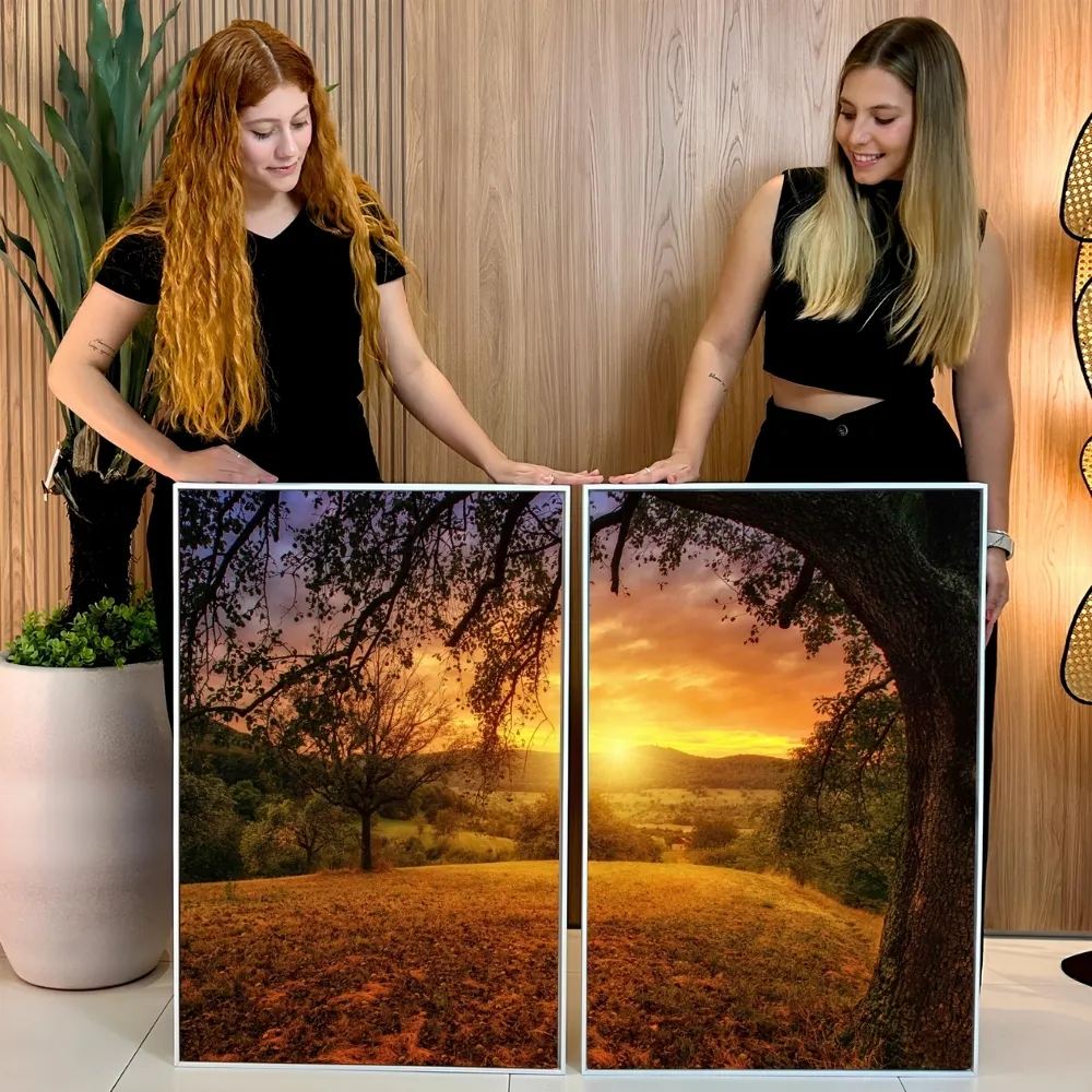 Na opção Canvas, com borda infinita ou moldura, as artes são impressas em tecido e esticadas em chassi de madeira, sem uso de vidro frontal.