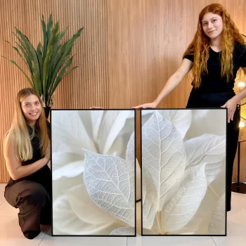 Na opção Canvas, com borda infinita ou moldura, as artes são impressas em tecido e esticadas em chassi de madeira, sem uso de vidro frontal.