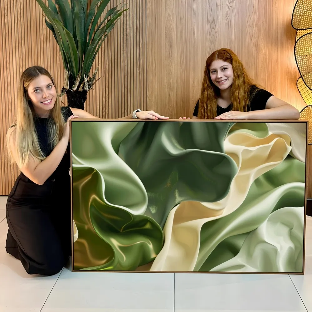 Na opção Canvas, com borda infinita ou moldura, as artes são impressas em tecido e esticadas em chassi de madeira, sem uso de vidro frontal.